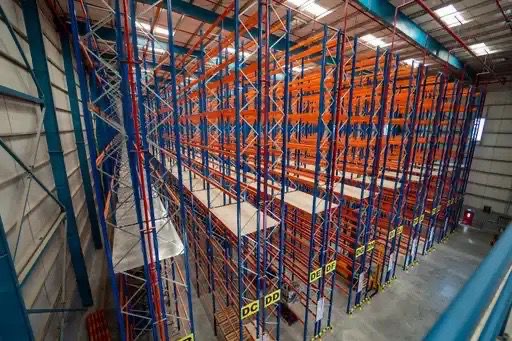 A high-bay warehouse setup supporting large-volume storage with precision racking and optimized aisle layouts.